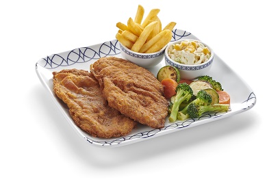 Fried breaded chicken fillet served with french fries, coleslaw & vegetables