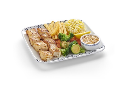 Fish fillet skewers served with french fries, rice, & vegetables.