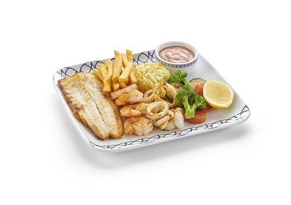 Fried fish fillet, shrimp and calamari served with french fries, saffron rice, & vegetables